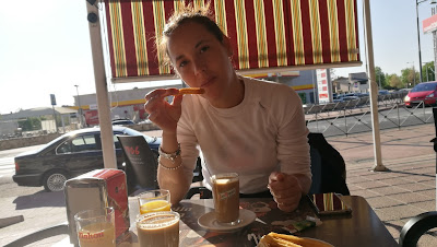 Nos levantamos pronto para no llegar de noche a casa. La primera parada la hacemos en Guadarrama donde desayunamos, no sabemos cuando va ser el siguiente sitio donde pararemos.
