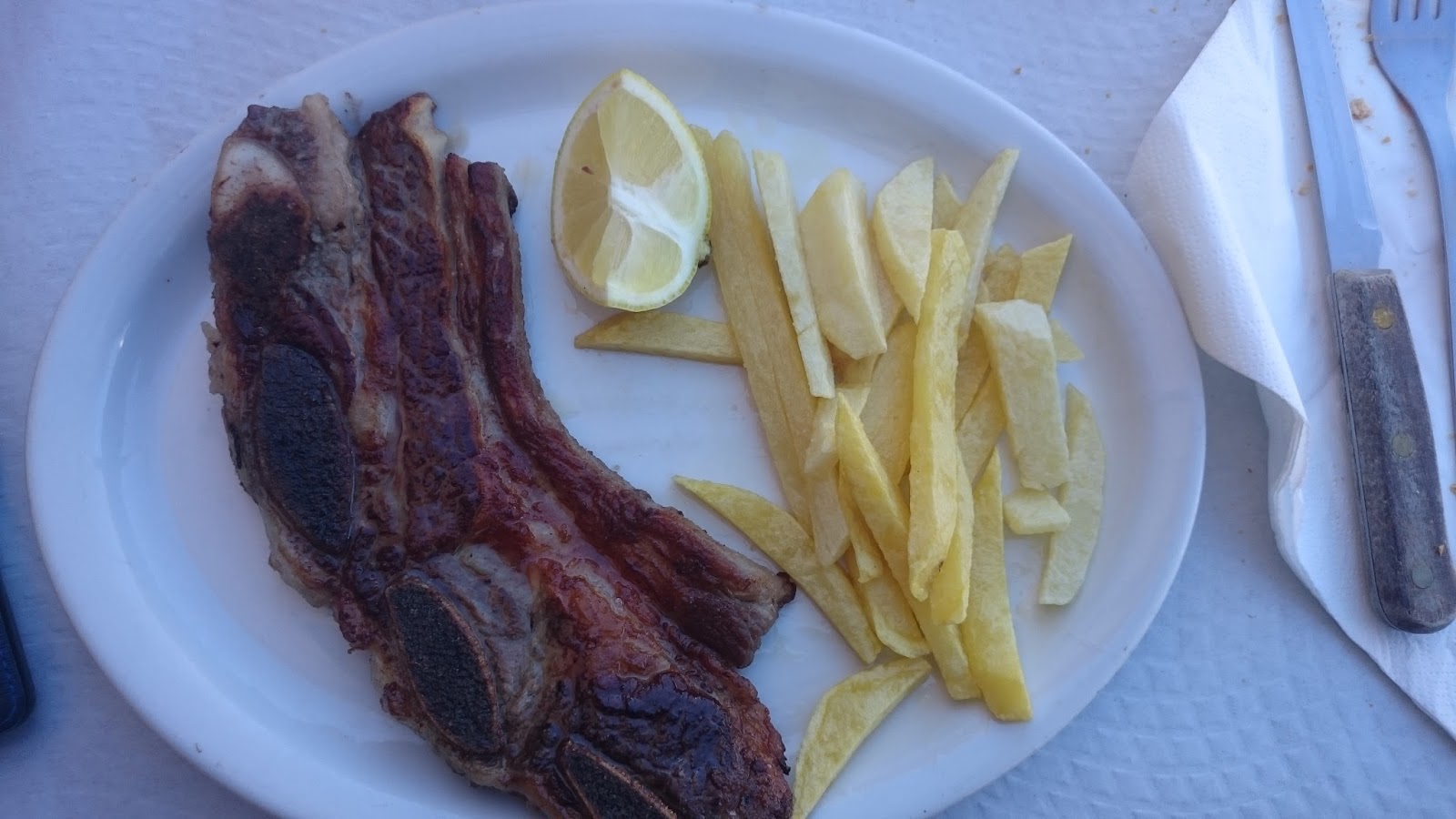 Llegamos a Patones de Abajo sobre la 13:00 de la tarde y veo que puedo aprovechar para comer, me paro en un bar que está en la misma carretera que atraviesa el pueblo. El bar se llama la Colmena y el menú esta por 9 €. Pido un pisto con huevo y una tira asada y la verdad la carne esta muy buena. El dueño del bar un tío muy agradable.
